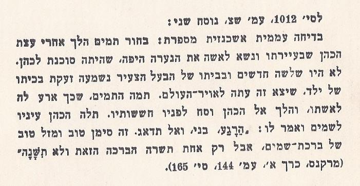 בתולה נישאה, וחמישה חודשים אחרי החתונה ילדה. ליגלגו השכנות ואמרו לאמהּ: דומה, שבתך זריזה קצת יותר מדי. החזירה האם: בתי תחיה ילדה היא עדיין ואינה בקיאה בדבר, שאשה יולדת לתשעה... [נוסח אחר: החזירה האם: בתי תחיה ילדה היא ואינה בקיאה עדיין במנהגי-לידה. מובטחה אני, שמכאן ואילך לא יארע לה כך...] |
