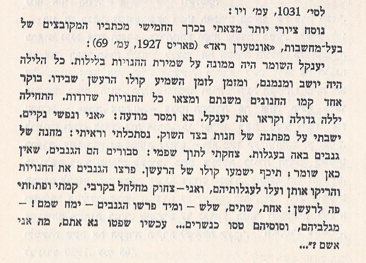 תחילה לא היו להם לחלמאים אלא בתים לדירה ולתורה ולתפילה, ולהבדיל דירים לבהמה גסה ולבהמה דקה. לאחר-זמן דקוּ ומצאו, שאין העולם מתקיים בלי מקח-וממכר, עמדו ותיקנו להם גם חנוּיות. ומפחד גניבה בלילות העמידו שומר לשמור על החנוּיות. ואדם מהימן היה השומר ועשה שליחותו באמונה: כל הלילה היה מהלך מחנות לחנות ומסתכל, שמא באו גנבים. פעם אחת נסתכל וראה: באו שלושה גנבים, פתחו דלתהּ של חנות והתחילו טומנים את הסחורה בשקים. צחק השומר בקירבו – ולא השמיע קול. ולאחר שכּילוּ הגנבים מלאכתם אשר עשו והעמיסו את השקים על שכמיהם והלכו להם, פרץ צחוק גדול מפיו: טיפשים שכמותם! דקדקו לבוא דווקא בלילה, שלא יראה אותם אדם, – ואילו אני ראיתי אותם וכל אשר עשוּ... |