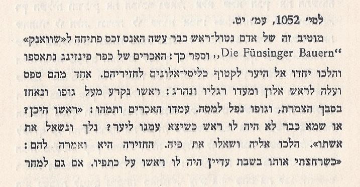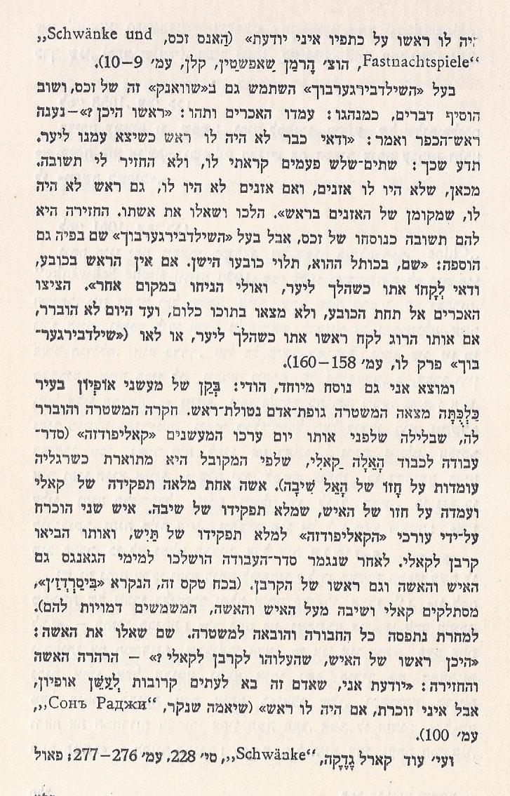 מעשה ונעלם רבהּ הגדול של חלם. מיד יצאו כל בני-העיר לבקשוֹ בבורות, שיחין ומערות. ביקשו ומצאו: אדם בלי ראש. ולא ידעו החלמאים, אם היה לרבם ראש, או שלא היה לו ראש. הלכו ושאלו את השמש, שהיה משמש את הרב כל יום בבית-המדרש. אמר להם השמש: איני יודע. הוא, עליו השלום, היה תמיד עטוף טלית ומימי לא זכיתי לראותו אלא למטה מטליתו. הלכו ושאלו את הבּלן, שהיה משמש את הרב כל ערב-שבת וערב יום-טוב במרחץ. אמר להם הבלן: איני יודע. הוא, עליו השלום, היה תמיד עולה לאיצטבה העליונה, המכוסה הבל, ומימי לא זכיתי לראותו אלא למטה מארכובותיו. הלכו ושאלו את הרבנית. אמר להם הרבנית: איני יודעת. הוא, עליו השלום, היה תמיד כאילו כפאו שד, ומימי לא זכיתי לראותו אלא למטה מאבנטו... ולא הוברר לחלמאים עד היום הזה, אם היה לרבם ראש, או שלא היה לו ראש... [נוסח אחר: הלכו ושאלו את השמש. אמר להם השמש: בּרי לי, שהיה לו זקן, שכּן כל שערה ושערה, שנשרה לו מזקנו, היה טוֹמנהּ בגמרא. אבל אם היה לו ראש – איני יודע . הלכו ושאלו את הבלן. אמר להם הבלן: בּרי לי, שהי לו פיאות, שכּן כל ערב-שבת וכל ערב יום-טוב היה חופפן בחמין. אבל אם היה לו ראש – איני יודע. הלכו ושאלו את הרבנית. אמרה להם הרבנית: בּרי לי, שהיה לו חוטם, שכּן כל ערב-שבת וכל ערב יום-טוב הייתי מכינה לו טבּק להריח. אבל אם היה לו ראש – איני יודעת. ולא הוברר להם לחלמאים עד היום הזה, אם היה לו לרבם הגדול ראש, או שלא היה לו ראש...] |