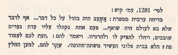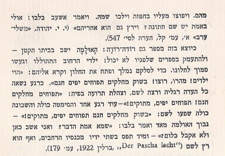בשעה שדעתו של שקרן זחוחה עליו הוא פותח חלונו לרחוב וּמשׁקר לבריות: יהודים, שם, בּמבוֹבי, פרה פורחת מעל לגג... והבריות נשמעים לו. אחד נושא רגליו ורץ אל המבוֹי, אחריו – שני, שלישי, רביעי, גדולים וקטנים רצים לראות את הפרה הפורחת מעל לגג. אז יקום השקרן ממקומו, יסגור חלונו, ילבש מעילו וירוץ גם הוא אל המבוֹי: שמא באמת פרה פורחת מעל לגג... |