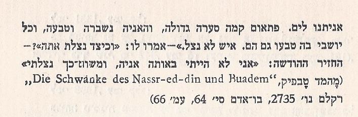 ההוא שבא אל הרב: רבי, שאלה יש לי לשאול: חייב אני לברך ברכת-הגומל, או לאו? שאל הרבה: מה נס נעשה לך? השיב השואל: אתמול היה מעשה. הלכתי יחידי ביער. איש לא היה עמי. אני ומקלי. פתאום – תּוּף, תּוּף, תּוּף,: שנים-עשר גזלנים לקראתי, מבני-הענק, וכוּלם עלי... תמה הרב: וכיצד ניצלת? החזיר השואל: אל רחום וחנון ה'. עשה נס – וכל אותו מעשה שקר וכזב... רבי, חייב אני לברך, או לאו?... |