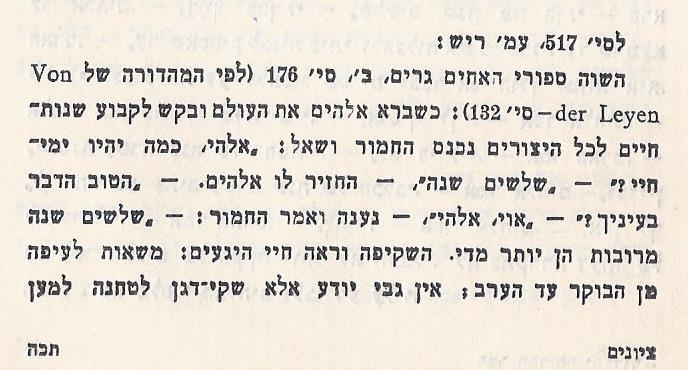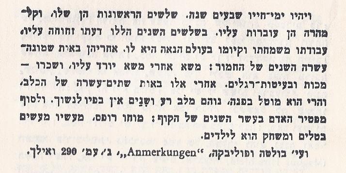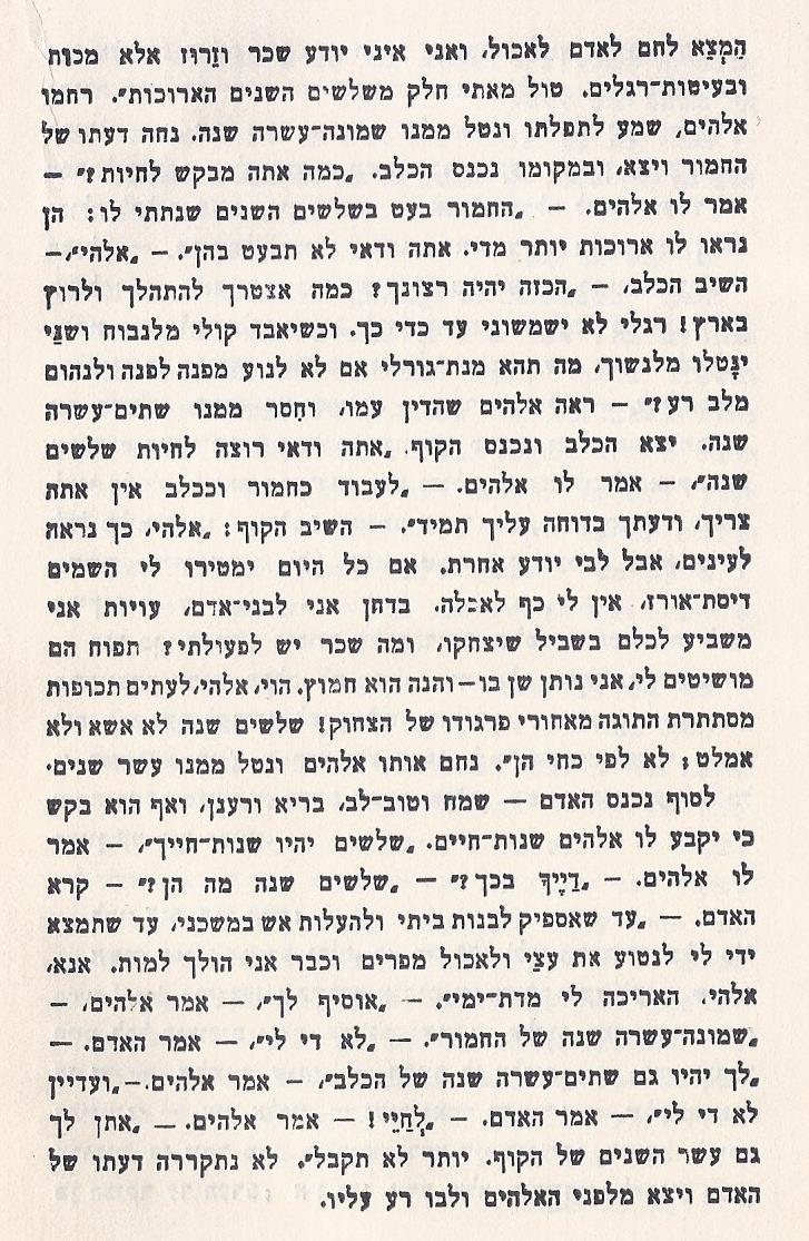אגדה של חזנים. בשעה שברא הקדוש ברוך-הוא את העולם עלה במחשבה תחילה ליתן ארבעים שנה לכל ברייה. נכנס סוס ושאל: - מה תהא מלאכתי? השיב לו הקדוש ברוך-הוא: - הבריות ירכבו עליך. בעט הסוס ברגלו ואמר: - אם לכך אני נוצר, דיי בעשרים. הסכים הקדוש ברוך-הוא. יצא הסוס. נכנס אחריו חמור ושאל: - ואני מה תהא מלאכתי? השיב לו הקדוש ברוך-הוא: - משאות תשא על גבך. כפף החמור את ראשו ואמר: - אם לכך אני נוצר, טול ממני עשרים. הסכים הקדוש ברוך-הוא. יצא החמור. נכנס אחריו חזן ושאל: - ומה תהא מלאכתי שלי? השיב לו הקדוש ברוך-הוא: - מלאכתך תהא נקייה וקלה – תנעים זמירות. השתעל החזן ואמר: - אם לכך אני נוצר, הוסיפה לי עוד ארבעים. הסכים הקדוש ברוך-הוא והוסיף לו עשרים שנה של הסוס ועשרים שנה של החמור. ומכאן: עד ארבעים חזן שר כהלכה. מארבעים ואילך הוא צוהל כסוס ונוער כחמור. |