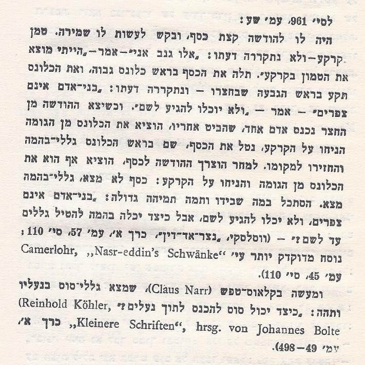 ישבו לספר בדיחות בציבור. פתח אחד וסיפר: גוי אשכנזי טייל ברחוב וראה: בונים בית גבוה חמש קומות, ובקומה העליונה מניחים מרישי-ברזל לחיזוק התקרה, וּמרישׁ אחד מלוכלך גללי-בהמה. תמה האשכנזי הטיפש ושאל: "כיצד הטילה הבהמה גלליה עד לשם?" שמעה החבורה את הסיפור וצחקה. היה שם תם אחד, לא צחק ושאל: באמת, כיצד הטילה הבהמה גלליה עד לשם? רגז המספר: חמור בצורת סוס! אותו מריש היה מונח תחילה על הקרקע, באה בהמה והטילה עליו גללים, ואחר-כך העלוהו למעלה, עד לקומה העליונה. לא נתקררה דעתו של התם, וחזר ושאל: זו מניין לך? באותו מעמד היית ובעיניך ראית?... |